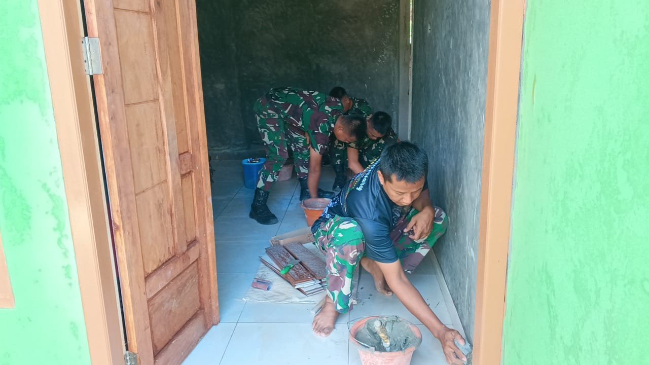 Pengerjaan rumah dilakukan dengan semangat gotong royong antara anggota Satgas TMMD dan masyarakat. Hari ini, Kamis (30/10/2025), kegiatan difokuskan pada tahap pemasangan keramik dan pengecatan dinding luar rumah.