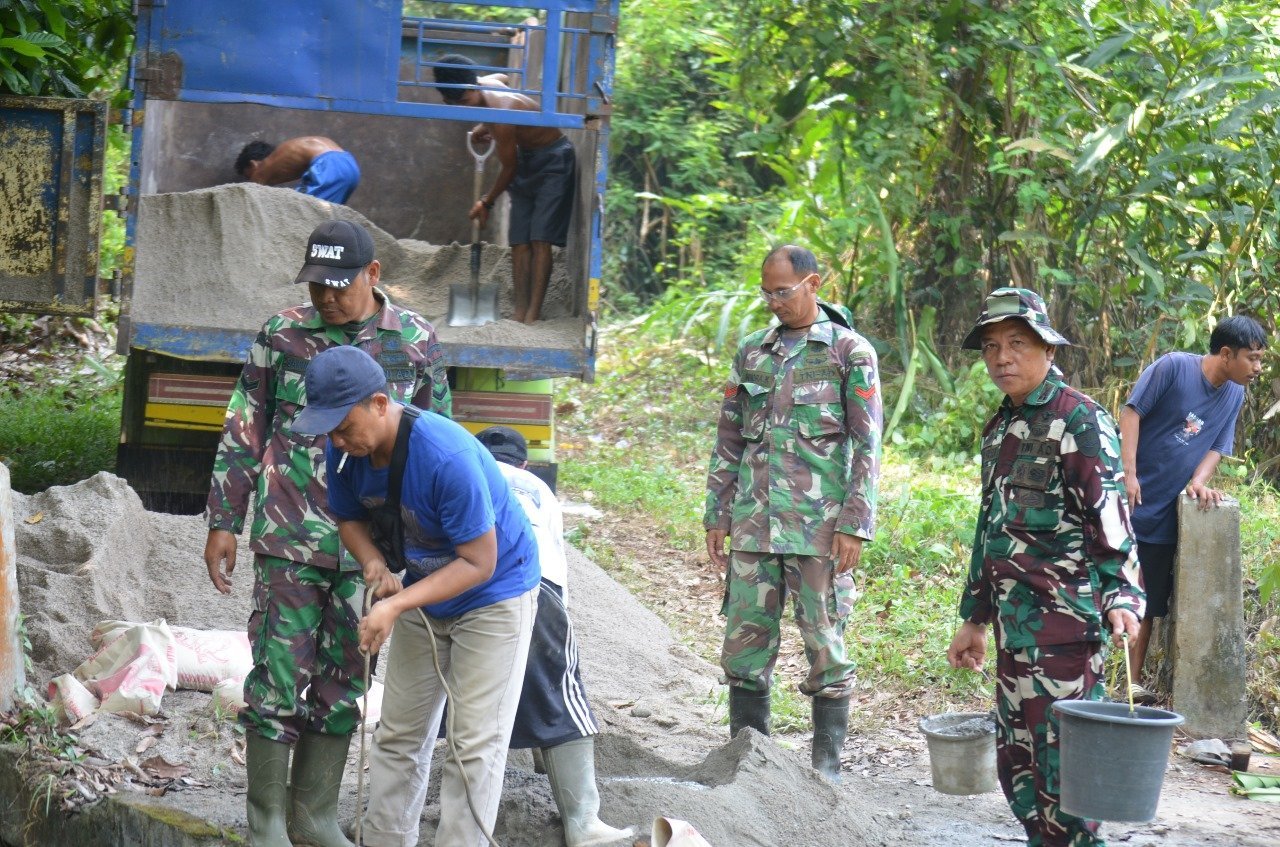 Dengan alat sederhana, personel Satgas TMMD bersama warga mengangkat batu, mencampur semen, dan memperkuat struktur pondasi jembatan. Kegiatan ini menjadi wujud nyata kemanunggalan TNI dengan rakyat dalam membangun desa.