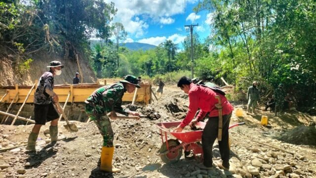 Sejak pagi, suara alat kerja dan canda tawa warga berpadu dengan komando para anggota Satgas di lokasi. Cuaca panas dan medan sulit tidak menjadi penghalang, justru menjadi penyemangat dalam menyelesaikan pekerjaan yang manfaatnya sangat dinantikan oleh masyarakat.