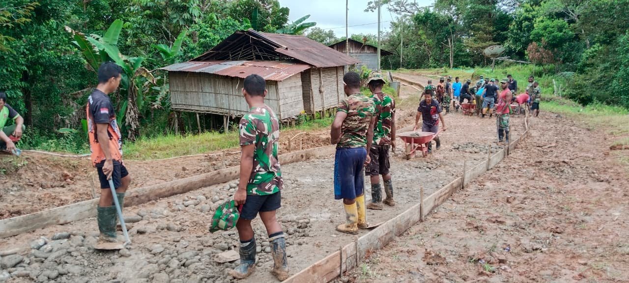 Pada Rabu (28/10/2025), di tengah guyuran hujan, personel Satgas dan warga tetap bekerja menuntaskan pengecoran jalan dan pembangunan fasilitas umum. Jalan yang becek serta peralatan yang licin tak menjadi penghalang bagi semangat kebersamaan mereka.
