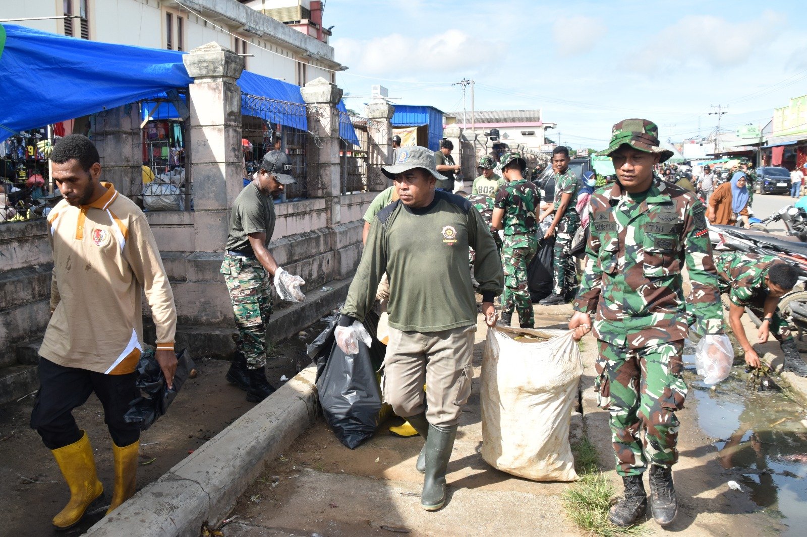 Karya bhakti ini melibatkan unsur TNI, Polri, aparat pemerintah daerah, serta masyarakat setempat yang turut bekerja bersama membersihkan area pasar, mulai dari pembersihan sampah di selokan, pengangkatan kotoran menumpuk, hingga pembabatan rumput liar di sekitar area pasar.
