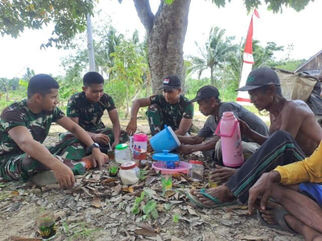Usai bekerja sejak pagi, prajurit dan warga duduk berdampingan di bawah teduhnya pepohonan, menikmati hidangan sederhana ala kampung yang disiapkan secara gotong royong. Tidak ada perbedaan atau pembatas antara aparat negara dengan warga, hanya tawa, perbincangan santai, dan suasana kekeluargaan yang terasa kuat.