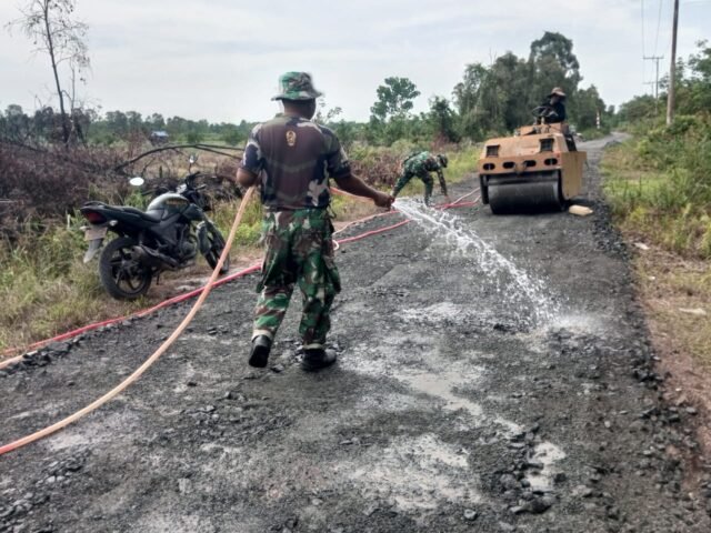 BARITO KUALA – Anggota Satgas TNI Manunggal Membangun Desa (TMMD) Ke-126 Kodim 1005/Barito Kuala terus bekerja di lapangan. Terlihat personel TMMD bersama alat berat melakukan proses pembasahan badan jalansebelum tahap pemadatan pada sasaran utama berupa pengerasan jalan sepanjang 1.850 meter dengan lebar 3,5 meterdi Desa Tumih, Kecamatan Wanaraya, Sabtu (18/10).
