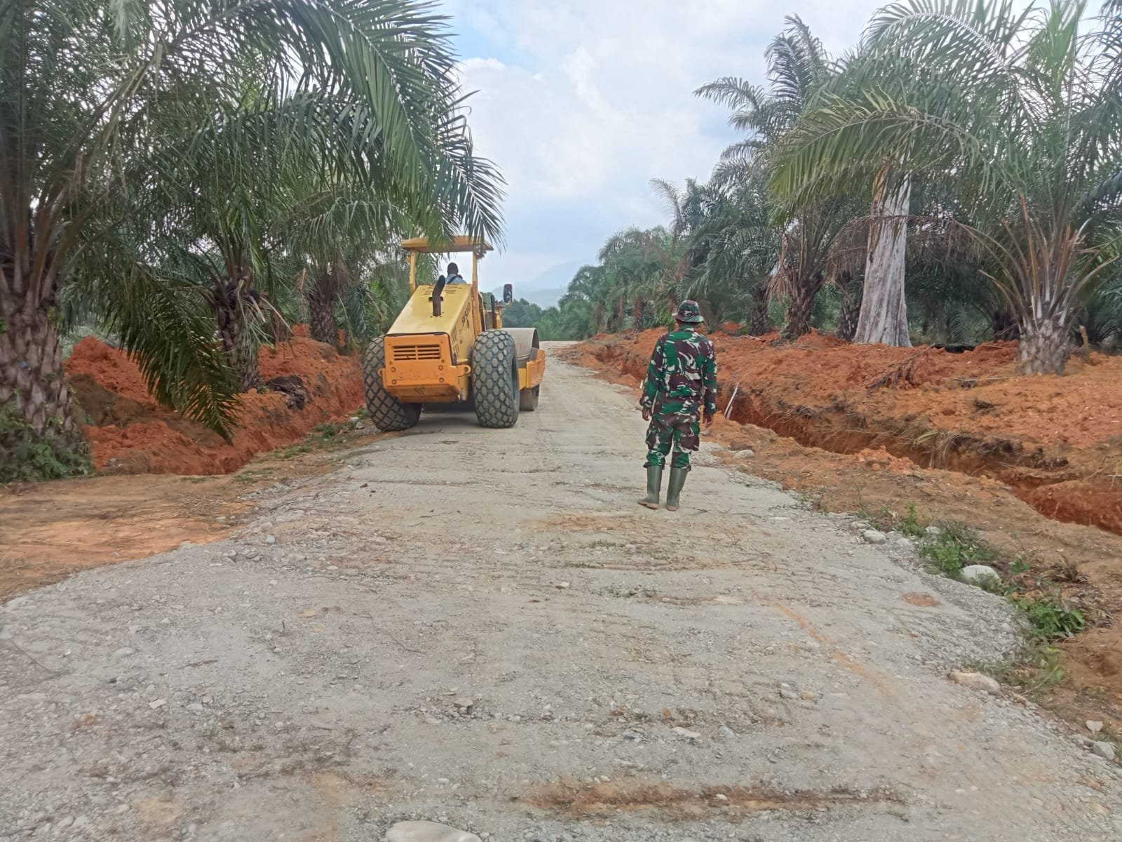 Sehari menjelang penutupan TMMD, pekerjaan di lokasi semakin dipercepat. Anggota Satgas bersama operator alat berat tampak fokus menyelesaikan setiap bagian jalan.