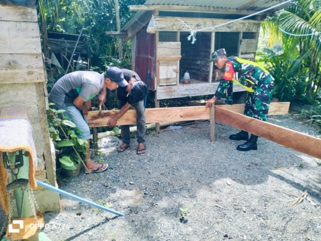 ACEH BARAT – Babinsa Koramil 03/Kaway XVI Kodim 0105/Aceh Barat, Sertu Ariyanto, bersama warga Desa Pungki, Kecamatan Kaway XVI, Kabupaten Aceh Barat, bergotong royong membangun dapur rumah salah satu warga. Kegiatan ini meliputi pembuatan bohplang sebagai persiapan pembangunan, Rabu (12/11/2025).