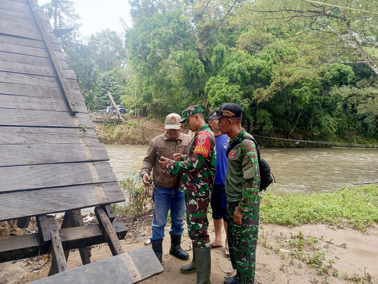 HULU SUNGAI SELATAN – Kapten Inf Yus Kristali, Perwira Seksi Teritorial (Pasi Ter) Kodim 1003/Hulu Sungai Selatan (HSS), bersama anggota melakukan kunjungan dan survei ke lokasi jembatan gantung yang putus diterjang banjir beberapa waktu lalu di Desa Tumingki 1, Kecamatan Loksado, Kabupaten HSS, Minggu (18/1/26).