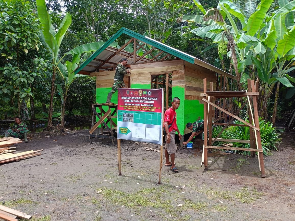BARITO KUALA – Panas terik dan hujan deras tak menyurutkan semangat Satgas TMMD Ke-126 Kodim 1005/Barito Kuala dalam menuntaskan sasaran pembangunan Rumah Tidak Layak Huni (RTLH) milik Kai Zaini, warga Desa Tumih, Kecamatan Wanaraya, Sabtu (01/11).