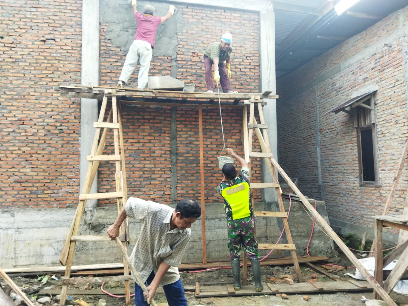 ACEH BARAT – Babinsa Koramil 03 Kaway XVI Kodim 0105 Abar, Serma T. Fahrial Putra, menunjukkan kepedulian dan semangat gotong-royong dengan membantu warga membangun rumah di Desa Beuregang, Kecamatan Kaway XVI, Kabupaten Aceh Barat, Jumat (18/07/2025).