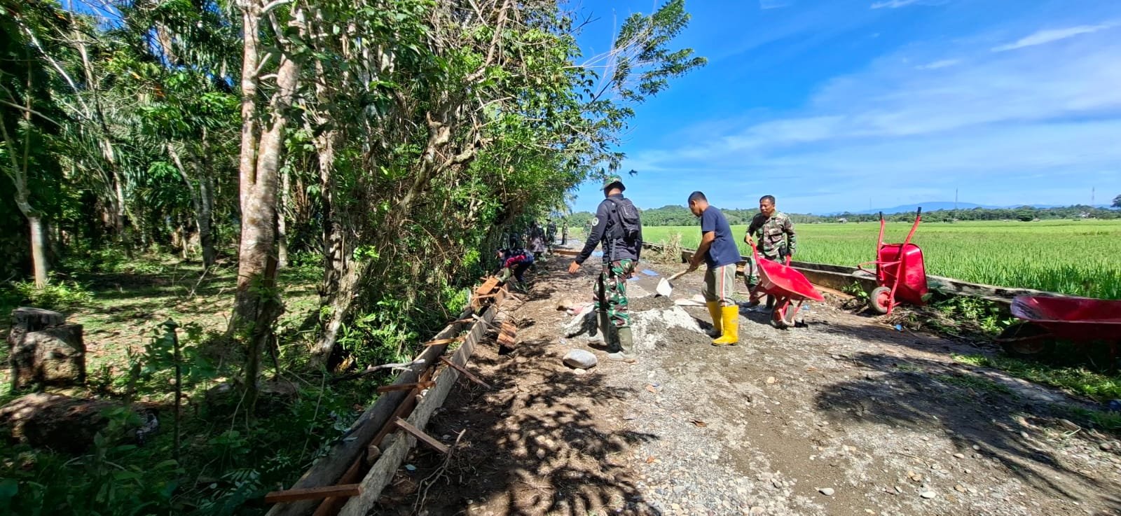Di tengah kesibukan pembangunan, suasana santai ini dijadikan kesempatan untuk mempererat tali silaturahmi. Para ibu-ibu dari Persit tampak akrab berinteraksi dengan warga dan anggota Satgas, saling berbincang serta berbagi cerita dalam suasana yang hangat.