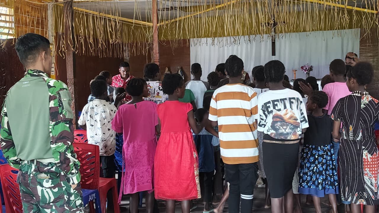 Mimika — Anggota Satgas TMMD ke-128 Kodim 1710/Mimika mengadakan ibadah bersama dengan warga Kampung Keakwa sebagai bentuk pendekatan humanis TNI terhadap masyarakat.