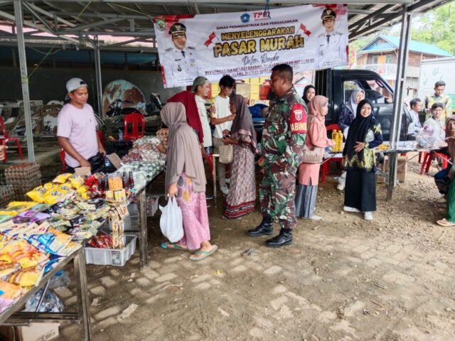 BALANGAN – Sebagai bentuk kepedulian terhadap kesulitan masyarakat, khususnya dalam memenuhi kebutuhan pokok, Babinsa Koramil 1001-01/Juai Kodim 1001/HSU-BLG, Serka Ali Ahmadi, melaksanakan pendampingan kegiatan Pasar Murah yang digelar oleh Dinas Perdagangan Kabupaten Balangan, pada Kamis (07/08/2025) bertempat di halaman Kantor Desa Galumbang, Kecamatan Juai.