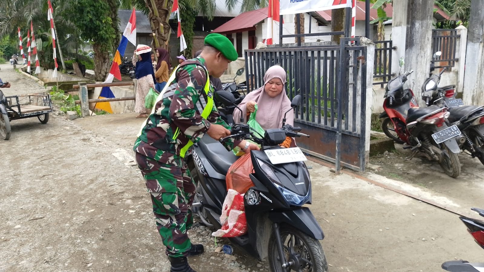 Para prajurit TNI yang tergabung dalam Satgas TMMD terlihat sigap membantu masyarakat. Ada yang mengatur antrean, ada pula yang dengan ringan tangan membantu warga membawa belanjaan sembako menuju kendaraan mereka.