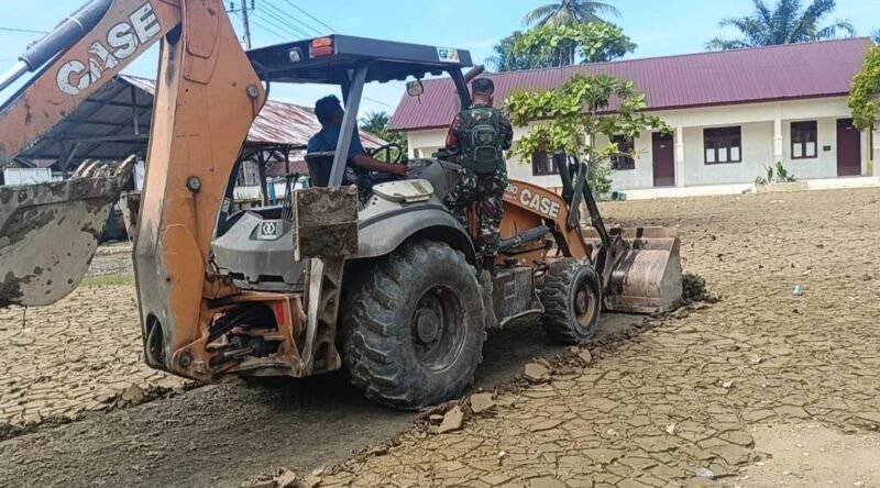Nagan Raya – Babinsa Posramil Tripa Makmur Serka Fuad Saifuddin dan beberapa babinsa lainnya melaksanakan kegiatan pembersihan sisa-sisa lumpur banjir yang terjadi di beberapa desa dalam kecamatan Tripa Makmur, kali ini pembersihan dilakukan di Sekolah Dasar Kuala Tripa. Kamis (01-01-2026).