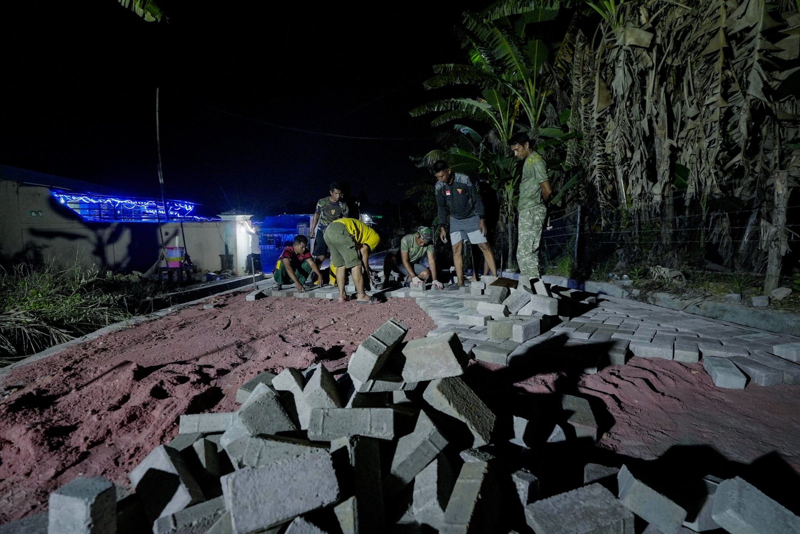 Kegiatan pengerjaan di malam hari ini merupakan salah satu strategi untuk mempercepat pembangunan infrastruktur, sehingga tenggat waktu penyelesaian proyek dapat tercapai. Di tengah suasana yang tenang, terlihat tangan-tangan terampil menyusun paving yang akan menjadi dasar jalan yang lebih teratur dan aman untuk dilalui.