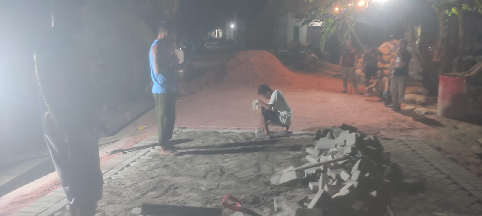 Dengan bantuan penerangan dari lampu sederhana, para prajurit dan warga terlihat saling bekerja sama dalam menyusun material paving blok secara bertahap, memastikan jalan yang sedang dibangun dapat segera diakses oleh masyarakat.