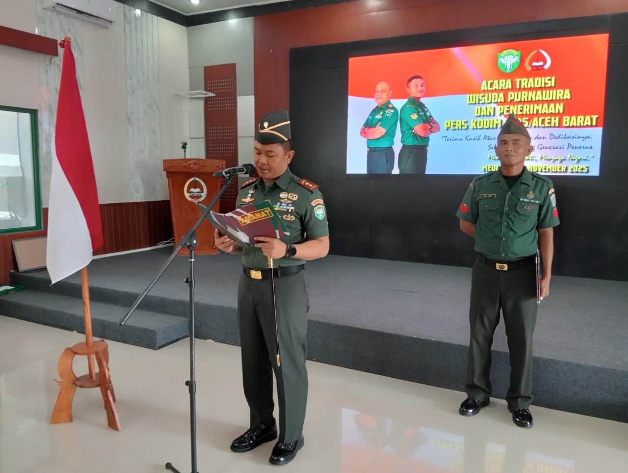 ACEH BARAT – Komandan Kodim (Dandim) 0105/Aceh Barat, Letkol Inf S. Kembaren, S.E., M.I.P., CFrA., memimpin upacara tradisi wisuda purnawira/pensiun dan penerimaan personel baru yang berlangsung di Aula Makodim 0105/Abar, Jalan Imam Bonjol, Desa Drien Rampak, Kecamatan Johan Pahlawan, Senin (03/11/2025).