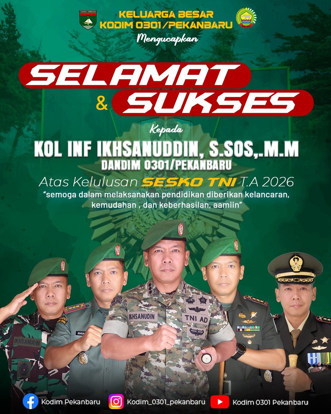 “Kami dari Keluarga Besar Kodim 0301/Pekanbaru mengucapkan selamat dan sukses atas kelulusan Kolonel Inf Ikhsanuddin. Semoga selalu diberi kesehatan, kelancaran, dan kesuksesan dalam menjalankan tugas ke depan. Aamiin Ya Rabbal Alamin,” demikian harapan yang disampaikan oleh pihak Kodim.