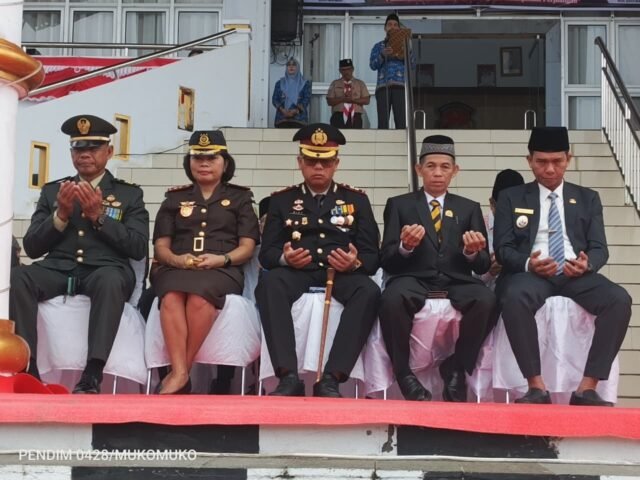 MukoMuko – Komandan Kodim (Dandim) 0428/MukoMuko, Letkol Inf Yokki Firmansyah, yang diwakili oleh Pasi Ops Kodim 0428/MukoMuko, Kapten Inf Budi Syahrial, bersama Forkopimda MukoMuko, Hadiri Upacara Hari Pahlawan ke-80, di Lapangan Upacara Pemda, Kelurahan Bandar Ratu, Kecamatan Kota MukoMuko, Kabupaten MukoMuko, Senin(10/11/2025).