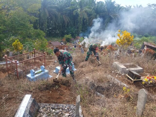 Mukomuko – Dalam upaya menjaga kebersihan dan kelestarian lingkungan, Personel Kodim 0428/Mukomuko bersama masyarakat Desa Lubuk Mukti, Kecamatan Penarik, Kabupaten Mukomuko, melaksanakan kegiatan gotong royong membersihkan area pemakaman, Jum’at(03/10/2025).