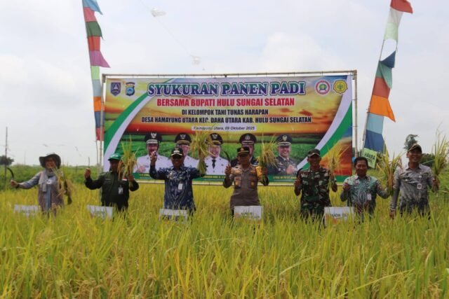HULU SUNGAI SELATAN – Berlokasikan di area persawahan Kelompok Tani Tunas Harapan Desa Hamayung Utara Kecamatan Daha Utara Kabupaten Hulu Sungai Selatan (HSS) Kapten Inf Abdi Brawijaya Danramil 1003-08/Daha Utara bersama Unsur Pemerintah Daerah Wakil Bupati HSS, H. Suriani, S. Sos, M. AP. Berserta masyarakat dan petani melaksanakan syukuran panen padi seluas 8.086 hektar dan cabai merah sebanyak 55 ribu pohon. Kamis (9/19/25) sore waktu setempat