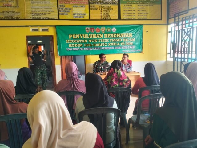 BARITO KUALA – Program TNI Manunggal Membangun Desa (TMMD) ke-126 Kodim 1005/Barito Kuala tidak hanya fokus pada pembangunan fisik, tetapi juga memberikan perhatian terhadap peningkatan kualitas sumber daya manusia melalui kegiatan nonfisik. Salah satunya adalah penyuluhan kesehatan yang digelar di Desa Tumih, Kecamatan Wanaraya, Kabupaten Barito Kuala, kAMIS (23/10).