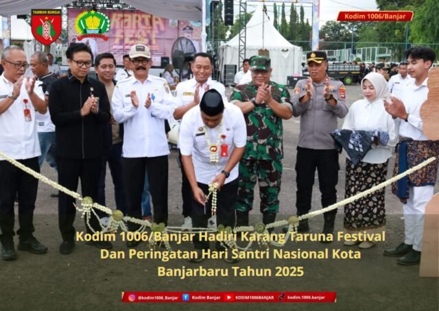 Banjarbaru – Kodim 1006/Banjar melalui Pabung Mayor Cpl Bagus Rijayatmo menghadiri kegiatan Karang Taruna Festival (KartaFest) 2025 yang dirangkai dengan peringatan Hari Santri Nasional tingkat Kota Banjarbaru. Acara berlangsung di Lapangan Dr. Murdjani, Jl. Panglima Batur, Kelurahan Komet, Kecamatan Banjarbaru Utara, Rabu (22/10/2025) sore.