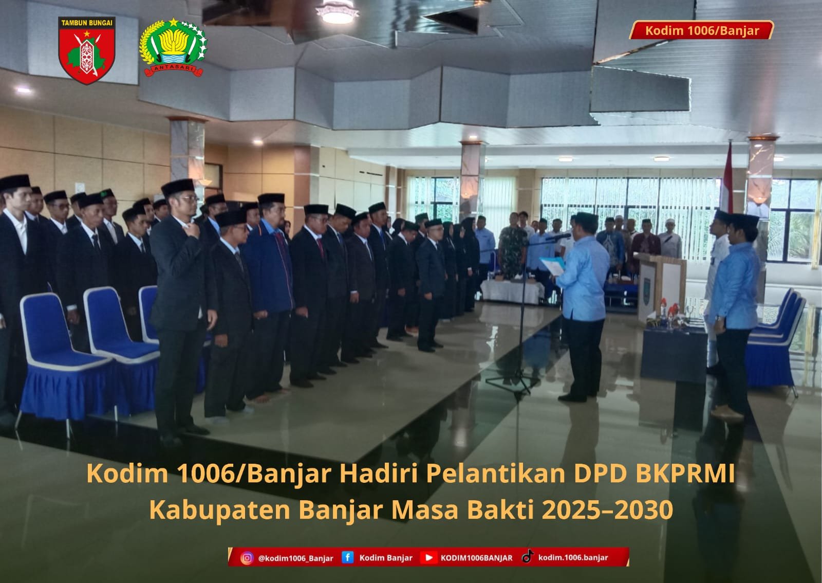 BANJAR – Kodim 1006/Banjar melalui perwakilannya, Kapten Inf Mustadir, menghadiri Pelantikan Dewan Pengurus Daerah Badan Komunikasi Pemuda Remaja Masjid Indonesia (DPD BKPRMI) Kabupaten Banjar Masa Bakti 2025–2030 yang berlangsung di Gedung Islamic Center Kabupaten Banjar pada Rabu (3/12/2025). Kehadiran perwakilan Kodim menjadi salah satu bentuk dukungan TNI terhadap penguatan organisasi kepemudaan berbasis masjid di wilayah Kabupaten Banjar.