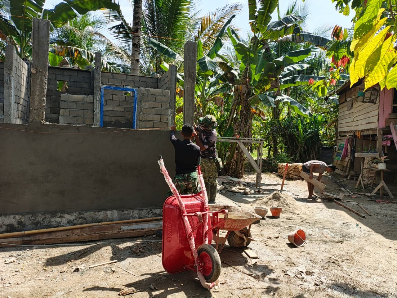 Pada hari ini, anggota Satgas bersama warga desa terlibat secara aktif dalam proses pengecoran lantai dan pemasangan dinding bangunan MCK. Kegiatan ini dilakukan secara bertahap dengan tetap memperhatikan standar kualitas dan daya tahan konstruksi.
