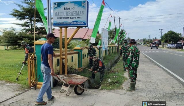 Mukomuko – Puluhan Personel Kodim 0428/Mukomuko dan masyarakat mengadakan kegiatan Jumat bersih dengan melakukan gotong royong membersihkan lingkungan Masjid Baiturrahman Kec. Kota Mukomuko Kab. Mukomuko, Jumat (03/10/2025).
