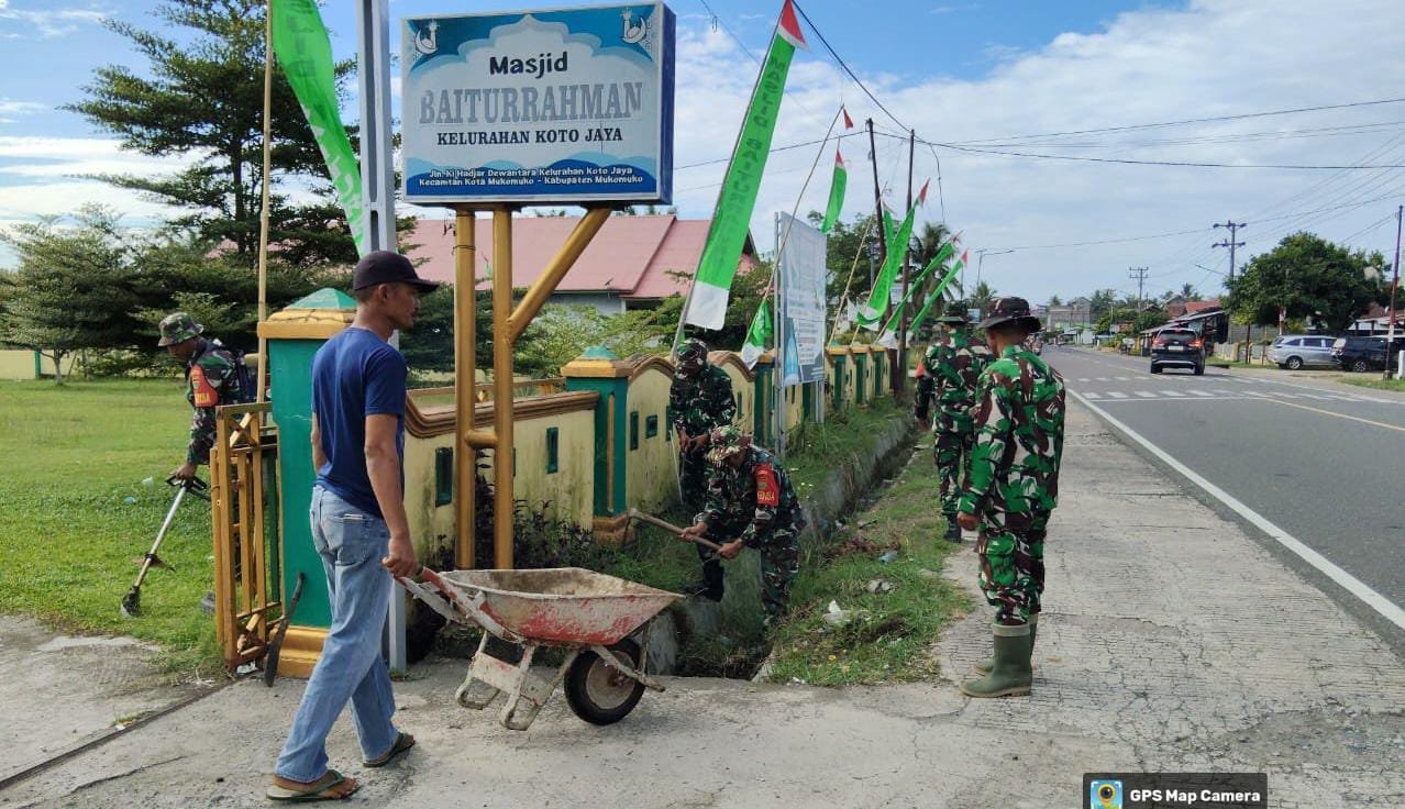 Personil Kodim 0428/Mukomuko bersama masyarakat setempat, bersama sama membersihkan lingkungan masjid mulai dari memotong rumput, membersihkan selokan, tempat wudhu sampai pada bagian dalam masjid.