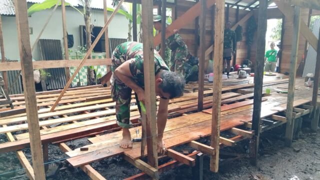 Pantauan di lokasi menunjukkan, personel TNI bahu-membahu menyusun papan kayu untuk lantai rumah milik Kai Zaini, yang kini sudah tampak mendekati tahap akhir pengerjaan. Kegiatan ini menjadi bagian penting dari rangkaian pembangunan RTLH yang sebelumnya telah meliputi pemasangan rangka atap, dinding, dan perbaikan struktur utama rumah.