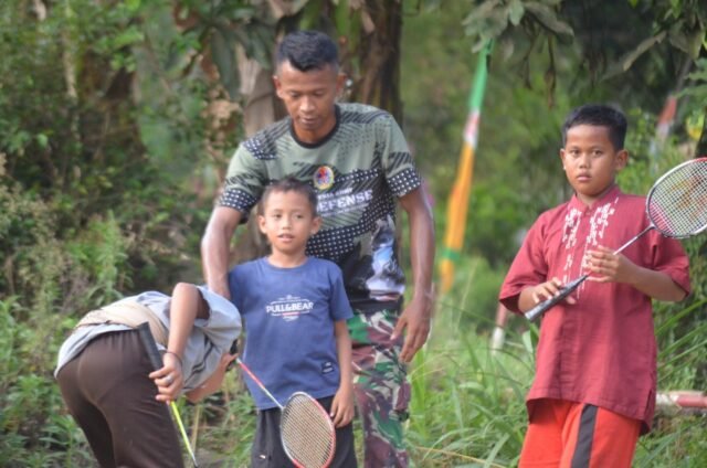 Letda Inf Harmanizar Bersama Anggota Latih Anak-Anak Bermain Bulu Tangkis di Kampung Sriwijaya