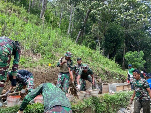 Dengan pakaian loreng yang basah oleh keringat, Letkol Amos tak segan ikut menggali, mengangkat batu, hingga membantu warga memindahkan material. Momen kebersamaan ini memperlihatkan kedekatan antara prajurit dan masyarakat tanpa jarak.