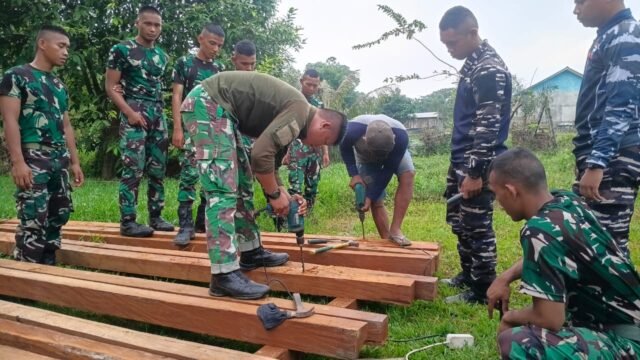 KUTAI TIMUR – Di bawah langit Desa Suka Rahmat yang cerah, beberapa prajurit TNI tampak membungkuk, fokus mengukur kayu balok dengan seksama, memastikan setiap dimensi sesuai dengan rencana yang telah ditetapkan, Jumat (25/07).