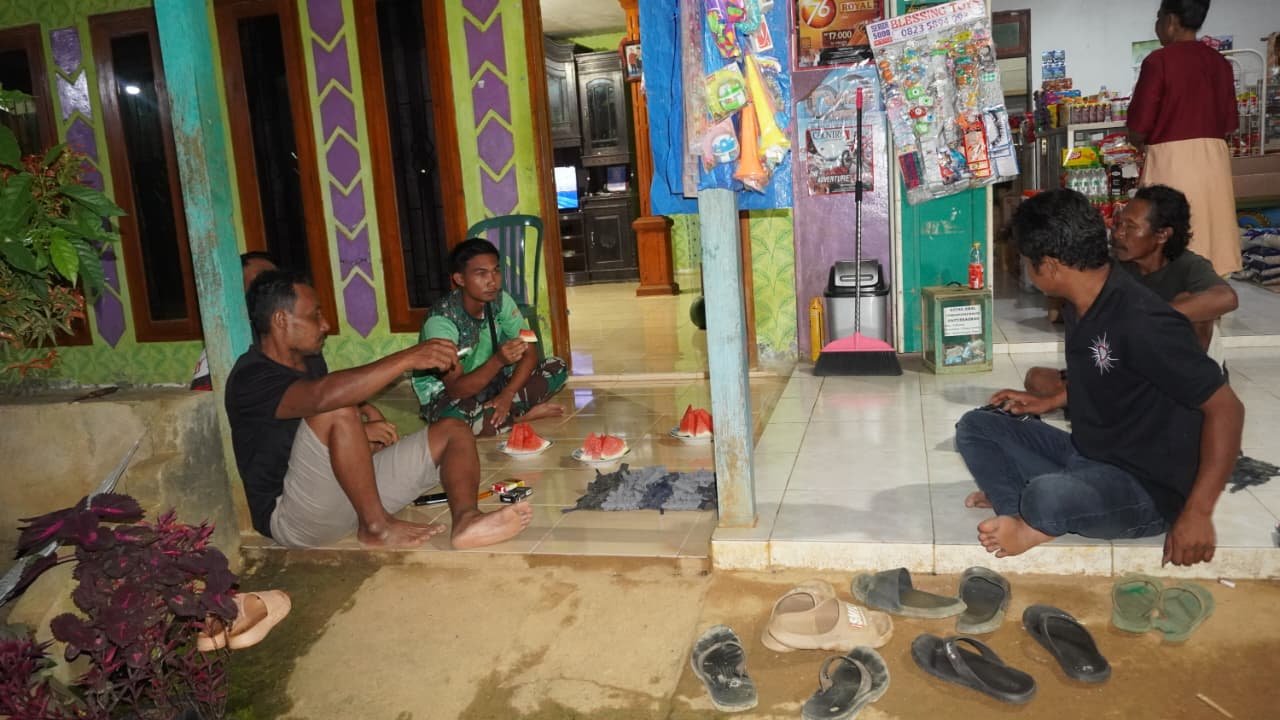Setelah menyelesaikan pekerjaan yang cukup melelahkan, para prajurit berkumpul di rumah salah satu warga untuk bersantai dan berbincang. Suasana akrab terpancar saat anggota Satgas dan masyarakat berbagi cerita sambil menikmati malam bersama.