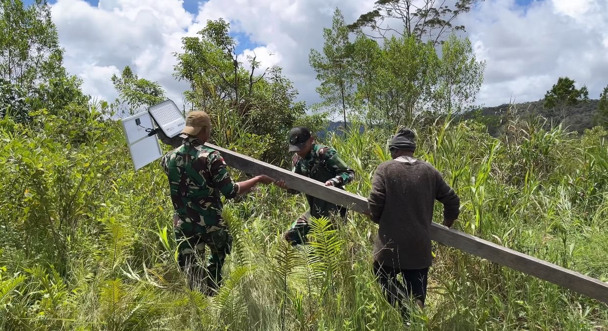 Kampung Kutdol dan Polsam, Pegunungan Bintang – Dalam upaya meningkatkan keamanan dan kenyamanan warga, Pos Okpol Satgas Pamtas RI–PNG Yonif 751/Vira Jaya Sakti (VJS) melaksanakan kegiatan anjangsana sekaligus pemasangan lampu penerangan pada Kamis, 8 Januari 2026. Kegiatan ini bertujuan untuk menjalin kedekatan dengan masyarakat sekaligus mengatasi salah satu kebutuhan mendesak dalam kehidupan sehari-hari mereka.