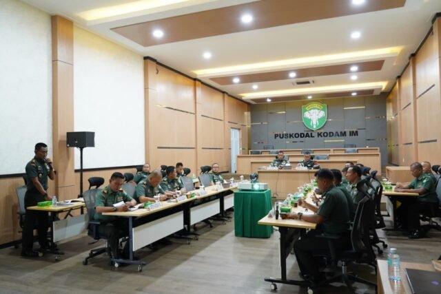 Banda Aceh – Kepala Staf Komando Daerah Militer Iskandar Muda (Kasdam IM) Brigadir Jenderal TNI Yudha Fitri menerima paparan dari Komandan Bela Negara (Danbelneg) Resimen Induk Daerah Militer Iskandar Muda (Rindam IM) Letkol Inf Andre Sagita Putra terkait perkembangan akhir kesiapan kegiatan Perkemahan Sabtu Minggu (Persami) dan Bela Negara Korps Kadet Republik Indonesia (KKRI) Gelombang III Tahun Anggaran 2025. Kegiatan paparan ini berlangsung di Ruang Vicon 1 Puskodal Kodam Iskandar Muda, Banda Aceh, pada Rabu (29/10/2025).