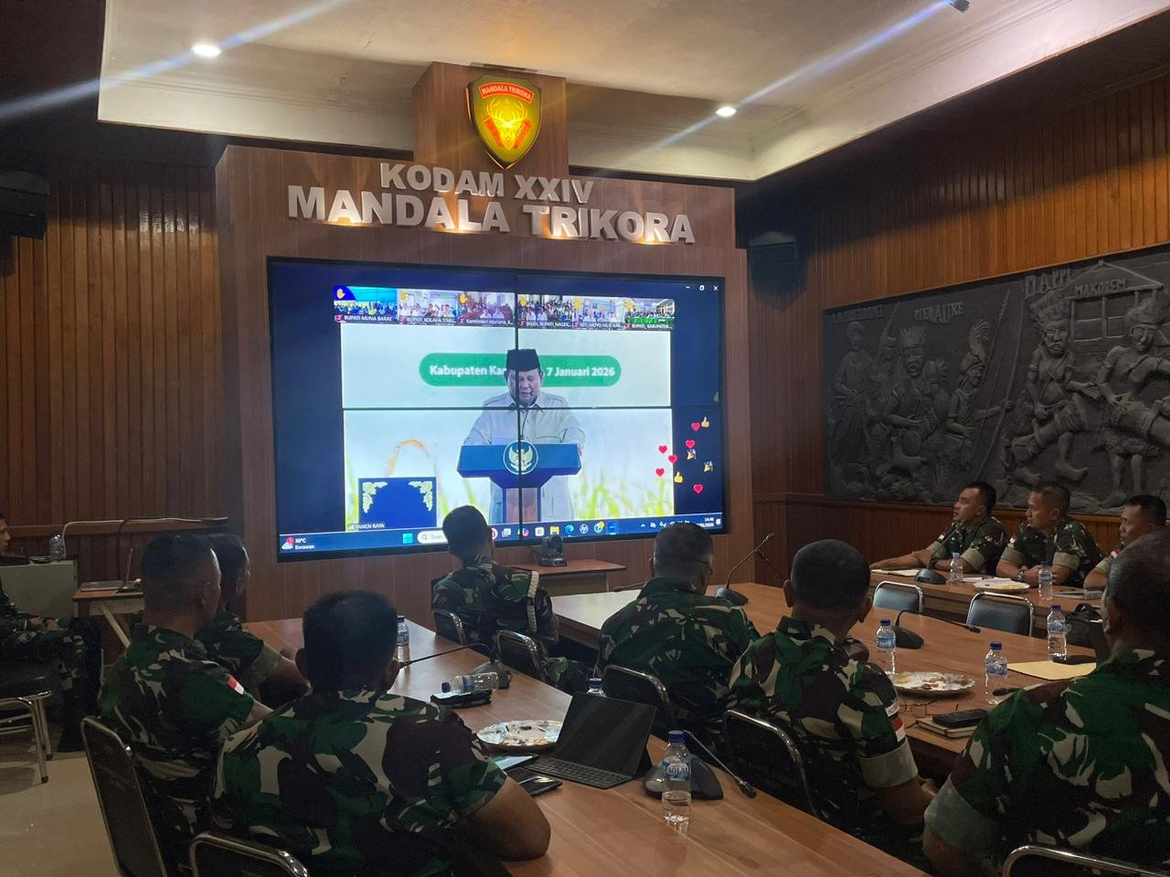 Merauke – Pangdam XXIV/Mandala Trikora, Mayjen TNI Lucky Avianto, S.I.P., M.Si., mengikuti kegiatan Panen Raya dan Pengumuman Swasembada Pangan Nasional bersama Presiden Republik Indonesia secara virtual, Rabu (07/01/2026). Kegiatan nasional tersebut dipusatkan di Kabupaten Karawang, Jawa Barat, dan diikuti jajaran Kodam XXIV/Mandala Trikora dari Ruang Rapat Mandala, Makodam XXIV/Mandala Trikora, Merauke, Provinsi Papua Selatan.