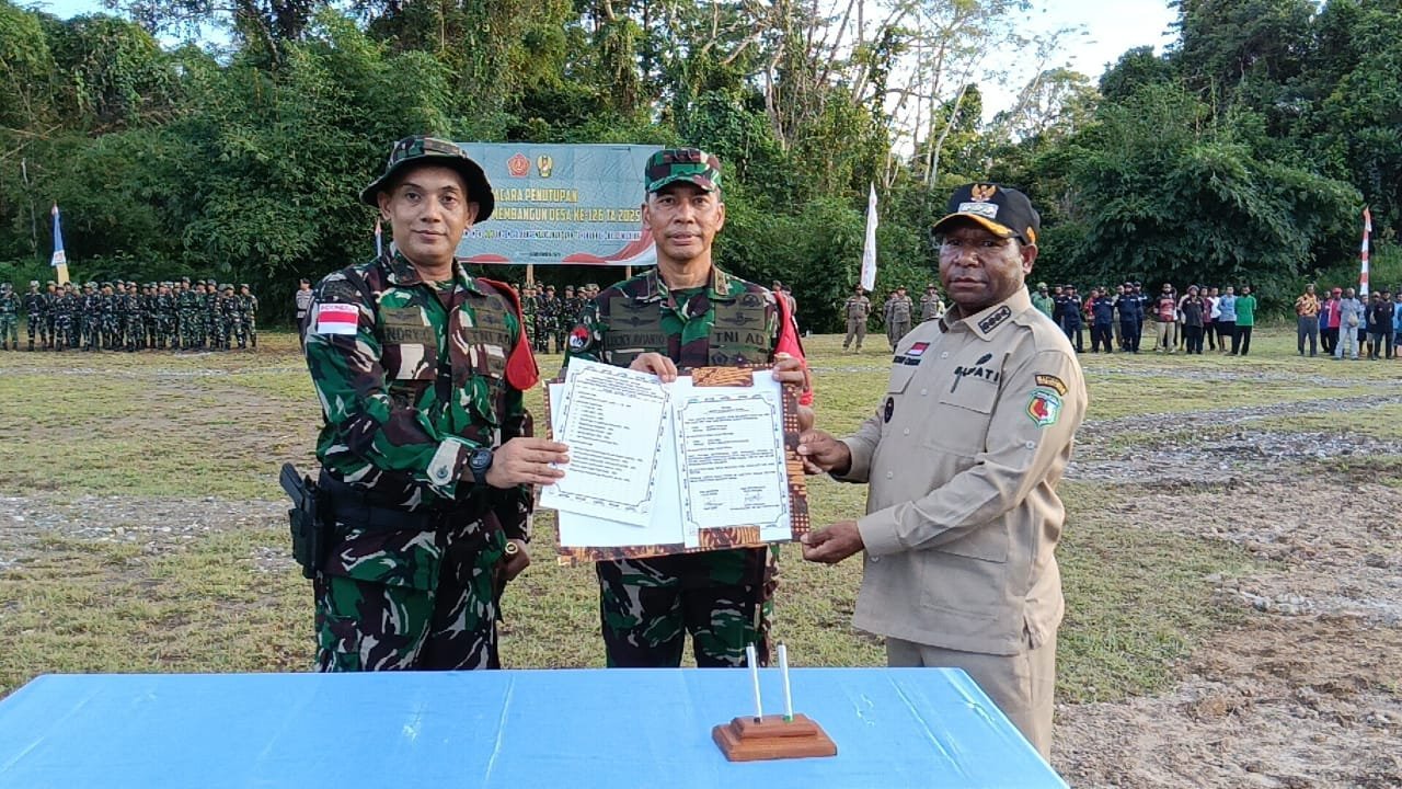 Boven Digiel – Pangdam XXIV/Mandala Trikora Mayjen TNI Lucky Avianto, S.I.P., M.Si., didampingi Ny. Dian Pujiwati Lucky Avianto Ketua Persit KCK Daerah XXIV/MT menutup secara resmi kegiatan TNI Manunggal Membangun Desa (TMMD) Ke-126 Tahun 2025, bertempat di lapangan Bola Kampung Waropko, Distrik Waropko, Kabupaten Boven Digoel, Provinsi Papua Selatan, Kamis (6/11/2025).