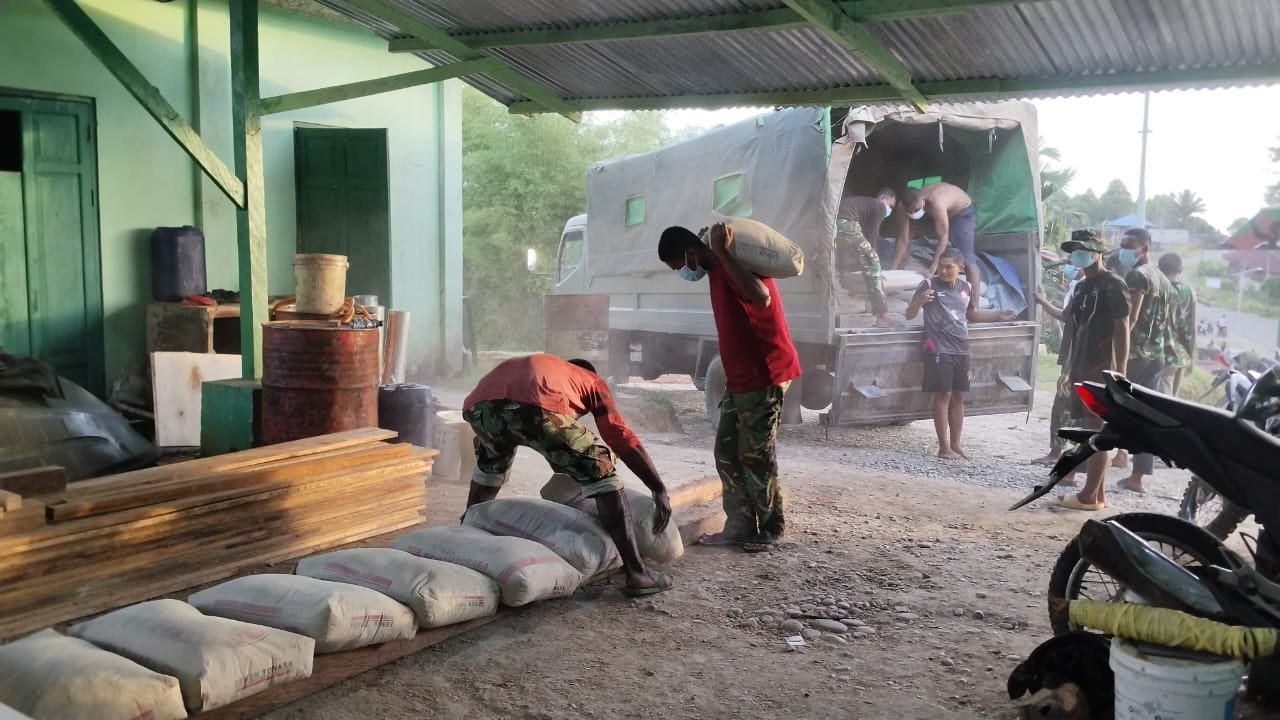 Pada Sabtu, 18 Oktober 2025, personel Satuan Tugas (Satgas) TMMD terlihat bahu membahu menurunkan material yang baru tiba dari truk, termasuk sak-sak semen. Material ini sangat krusial untuk menunjang berbagai sasaran fisik TMMD, seperti Pengecoran Jalan serta material lainnya untuk pembangunan Rumah Tidak Layak Huni (RTLH), serta Pipa Untuk Air Bersih.