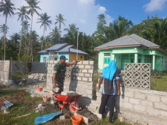 Halmahera Tengah-Babinsa Deda Bobane Jaya Serda Kamarudin Malik melaksanakan Giat Karbak membantu Masyarakat Membuat Pagar Jalan,di Desa Bobane Jaya, Kecamatan Patani Barat,Kabupaten Halmahera Tengah. Senin, (27/10/2025)