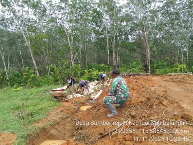 Balangan – Pembangunan Koperasi Desa Kreatif Mandiri Produktif (KDKMP) di wilayah Kodim 1001/HSU-BLG terus menunjukkan progres positif. Kegiatan pembangunan di titik KDKMP Desa Sumber Rejeki, Kecamatan Juai, Kabupaten Balangan kembali dilanjutkan dengan pekerjaan pemasangan batu pondasi. Pada hari Selasa (11/11/2025)