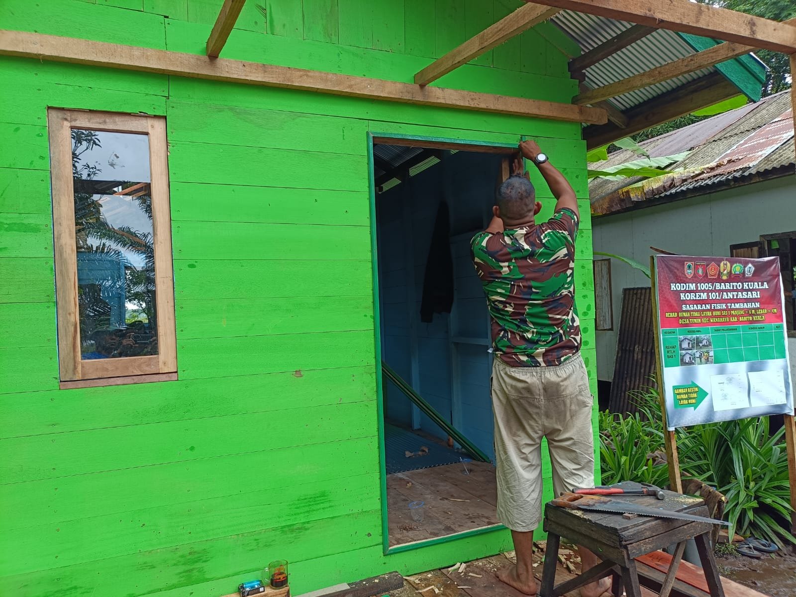 Senin (3/11), Peltu Hari Maladi tampak fokus melakukan pemasangan teras rumah milik Kai Zaini. Dengan keterampilan dan ketelitian, pekerjaan itu dikerjakan bersama warga agar hasilnya kokoh dan layak huni.