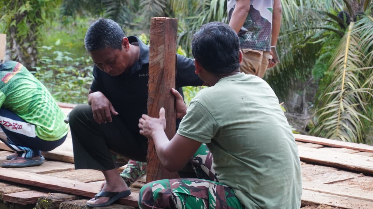 Kotawaringin Timur – Proyek pembangunan jembatan dalam program TNI Manunggal Membangun Desa (TMMD) Reguler ke-127 yang dikelola oleh Kodim 1015/Sampit di Kecamatan Telaga Antang terus menunjukkan kemajuan yang positif. Pada Sabtu, 7 Maret 2026, personel Satuan Tugas (Satgas) TMMD tengah melaksanakan tahap pemasangan lantai dan pagar jembatan, suatu langkah krusial dalam menyelesaikan konstruksi jembatan ini yang termasuk dalam sasaran fisik program TMMD tahun ini.