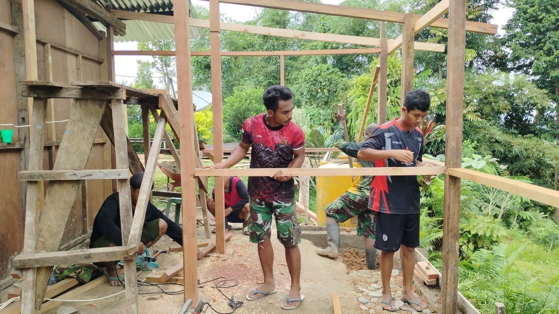 Personel Satgas bersama warga tampak bekerja penuh semangat di bawah terik matahari. Mereka bahu membahu menyiapkan material dan menyusun rangka bangunan agar proses penyelesaian dapat berjalan cepat dan hasilnya kuat serta rapi.