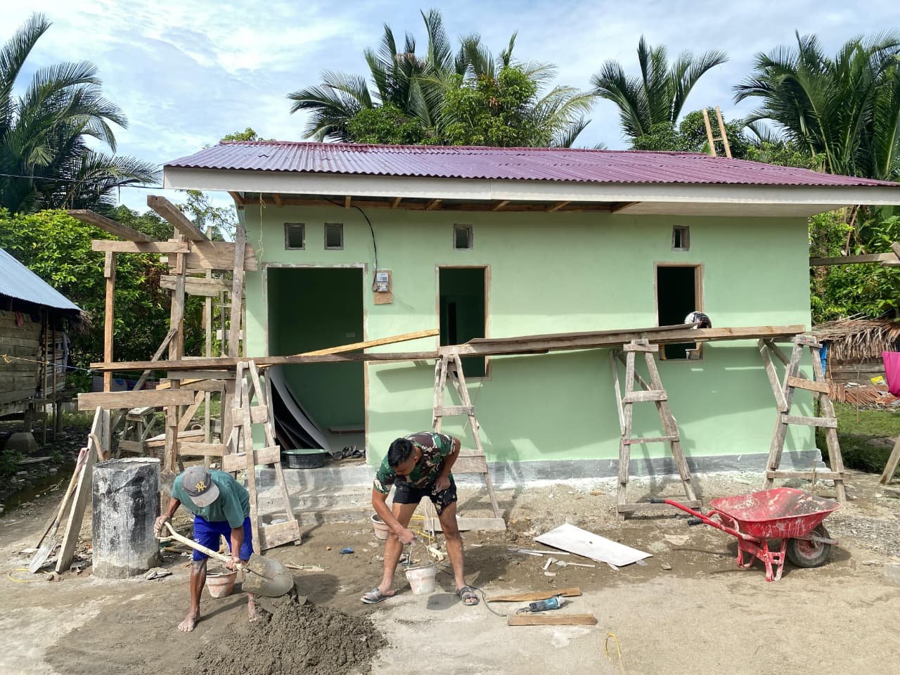 Selama proses pembangunan, anggota Satgas TMMD bekerja sama dengan penduduk lokal untuk menyelesaikan berbagai tahap, mulai dari pemasangan rangka bangunan, pembuatan dinding, hingga pengaturan interior rumah.