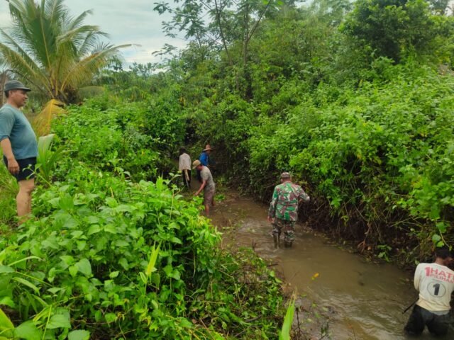 Kegiatan tersebut melibatkan personel Koramil bersama masyarakat setempat yang bergotong-royong membersihkan sampah, lumpur, dan rerumputan yang menghambat aliran air di sungai serta saluran irigasi pertanian. Langkah ini dilakukan untuk mencegah terjadinya penyumbatan dan genangan air yang dapat mengganggu aktivitas pertanian masyarakat.