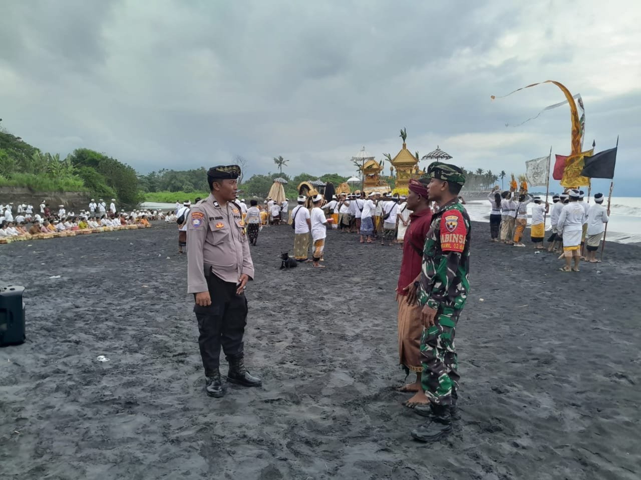 Kebersamaan itupun kembali tampak saat Serka Gede dan Bhabinkamtibmas begitu solid bersama para pecalang Banjar Adat Tegal Besar melaksanakan pengawalan dan pengamanan berlangsungnya upacara keagamaan Melasti Ida Sesuhunan Pura Segara Merta Sari Tegal Besar di Pantai Tegal Besar Desa Negari, Kecamatan Banjarangkan, Kabupaten Klungkung, Senin ( 03/11/25 ).