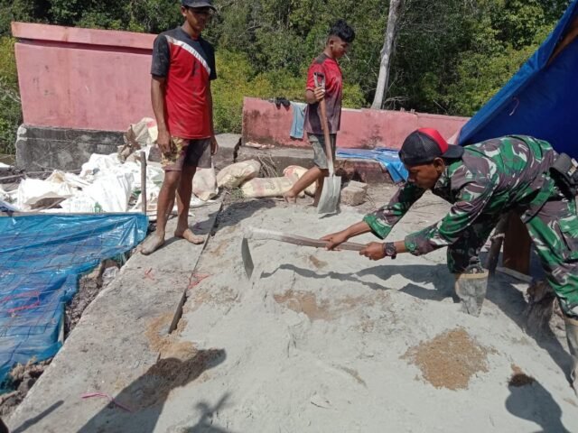 Meski di bawah terik matahari, semangat tak surut. Satgas TMMD dan warga setempat bersama-sama mencampur material, mengangkat adukan cor, hingga meratakan beton yang menjadi bagian vital dari pembangunan jalan desa.