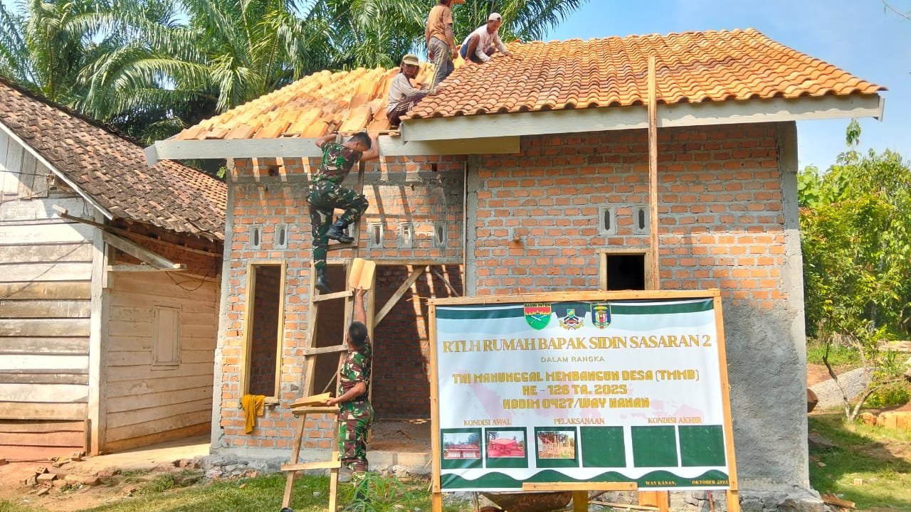 Way Kanan, Selasa (21/10/2025) – Program TNI Manunggal Membangun Desa (TMMD) ke-126 Kodim 0427/Way Kanan terus menunjukkan progres positif. Salah satu sasaran fisik, yakni Rehab Rumah Tidak Layak Huni (RTLH) milik Bapak Sidin di Kampung Sriwijaya, Kecamatan Umpu Semenguk, kini telah mencapai 70 persen, dengan pengerjaan memasuki tahap pemasangan genteng atap rumah.
